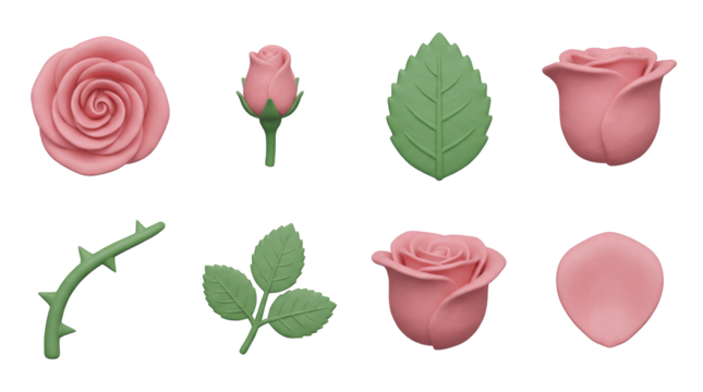 Pink rose set including flower heads, buds, petals, thorny stems, and leaves isolated. clay or plasticine garden floral collection.