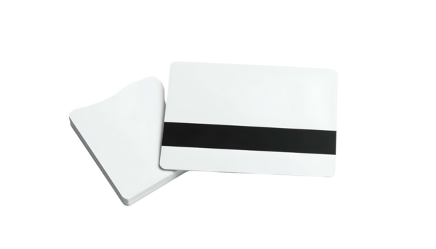 A stack of white rectangular cards with one displayed in front, showing a black magnetic strip