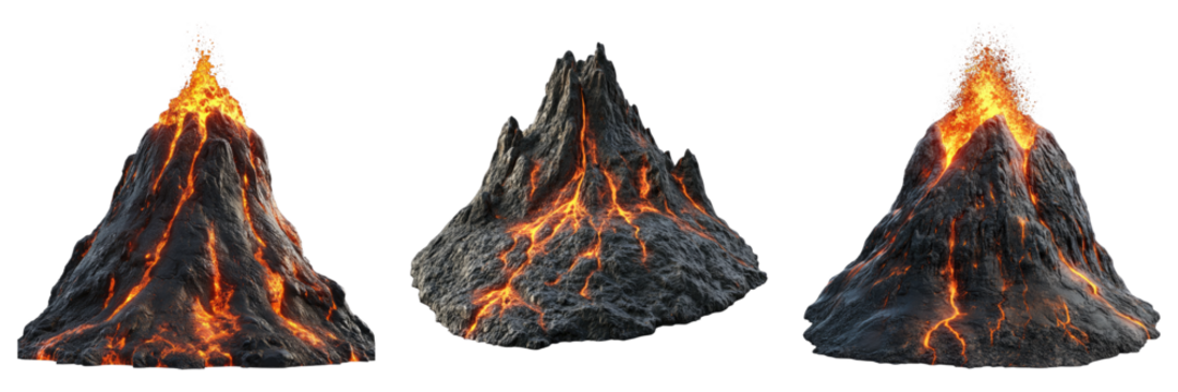 Volcanoes erupting with smoke and lava at the peak of volcanic activity during the early morning hours in a remote landscape
