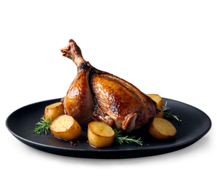 Exquisite French Confit de Canard, Slow-Cooked Duck Leg Served with Golden Potatoes and Aromatic Rosemary on a Sleek Plate, Perfect for Culinary Delights and Gourmet Presentations