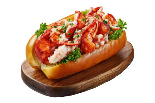 Lobster roll sandwich with lobster meat, lettuce and herbs in buttered bun on wooden plate, isolated on white transparent background. Concept of gourmet seafood cuisine meal