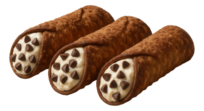 A cocoa-dusted cannoli with visible chocolate chips on a decorative platter
