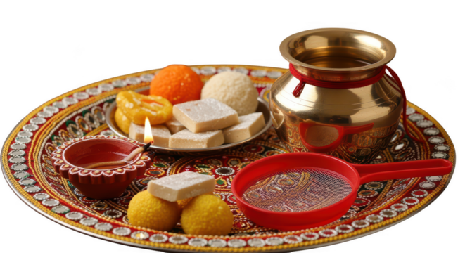 Festive Feast: A beautifully arranged platter laden with an array of colorful sweets and traditional elements, capturing the essence of joy and celebration.