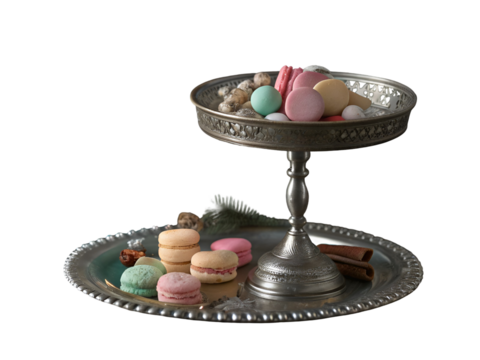 Silver tiered stand holding colorful french macarons and assorted confections isolated on a transparent background