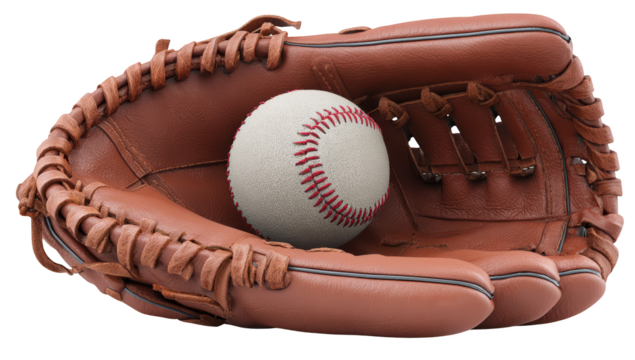 Worn leather baseball glove holding a new white baseball with red stitching isolated on a transparent background, perfect for sports themed projects