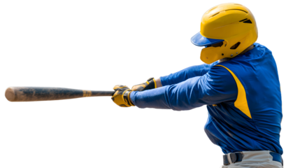 A baseball player in a blue and yellow uniform with a yellow helmet, swinging a bat, isolated on transparent background