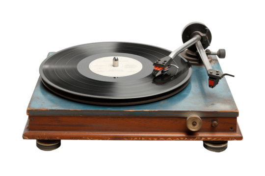 Vintage turntable with vinyl record. Classic music player for nostalgic audio enthusiasts and retro lovers. Isolated on a white background.