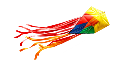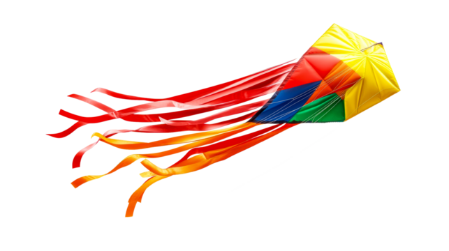 Catching summer breezes with a vibrant rainbow kite flying high against the black sky for carefree outdoor fun isolated on white background