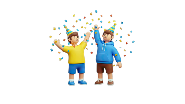 3D Cartoon Boys Celebrating with Confetti on White Background