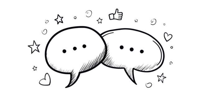 Two speech bubbles with dots inside, surrounded by stars and hearts, representing communication and conversation in a playful illustration with copy space. isolated image, transparent background