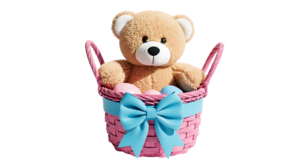 Cute teddy bear sitting in a pink woven basket with blue bow isolated on transparent background