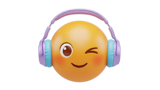 Winking emoji with headphones PNG isolated on transparent background, playful emoticon with music accessory for social media and design