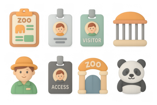 Cute zoo-themed badges and panda icons in cartoon style for kids