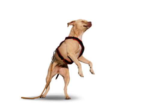 Upright dog with a happy expression showcasing its playful and adorable nature.
