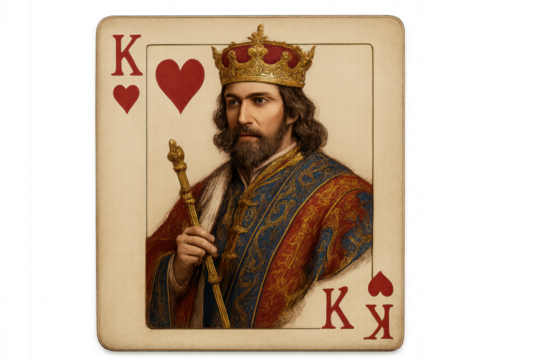 King of hearts playing card with detailed crown, red robe, and holding sword and orb, isolated on transparent background.