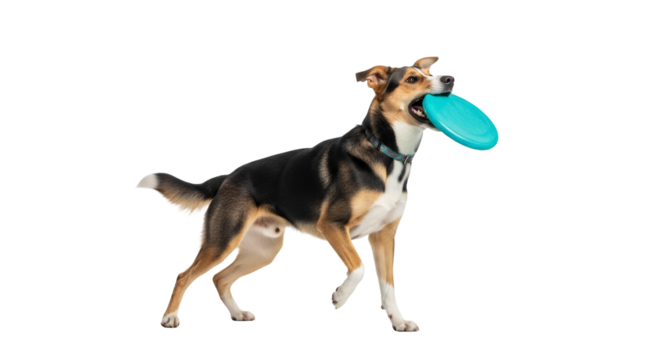 Energetic dog with frisbee against a clean backdrop highlighting a playful moment featuring the bond between pets and their owners