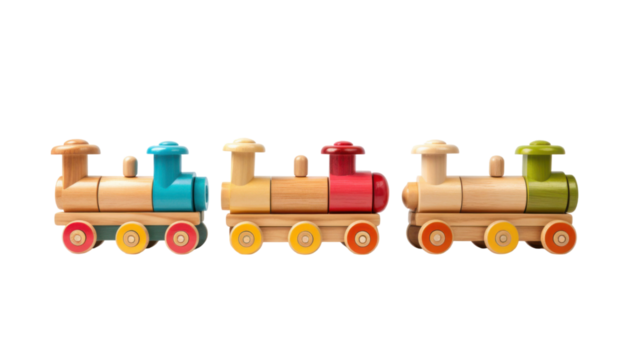 Three colorful wooden toy trains with bright paint, classic children's playset isolated on white background