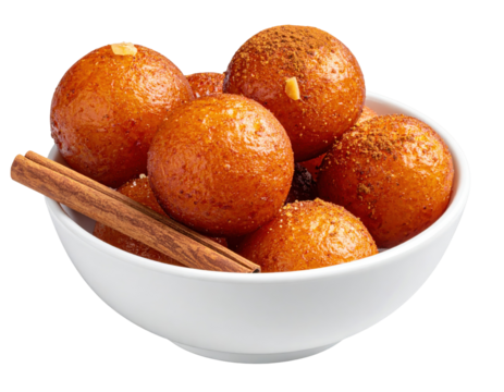 Golden Fried Dough Balls with Cinnamon Sticks in a White Bowl
