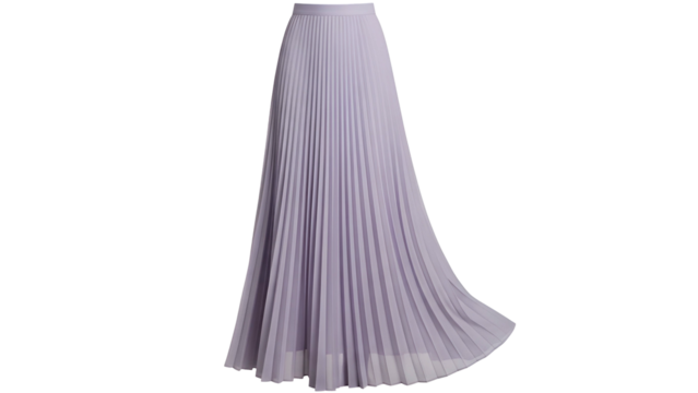 Flowing, floor-length pleated skirt in a soft lavender color, against a black background