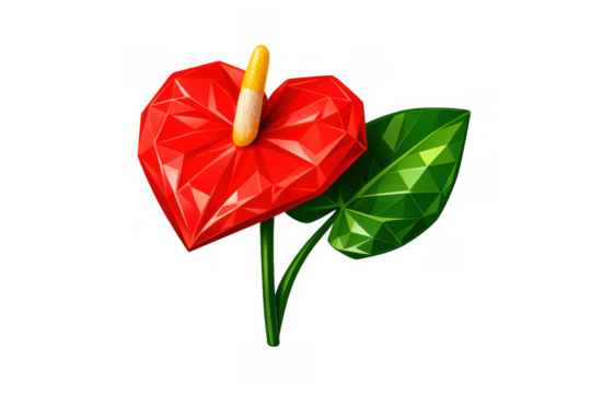 Low poly anthurium flower blooming with heart shaped petals and green leaves, geometric 3d vector illustration