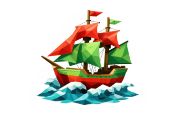 Low poly cartoon ship sailing on ocean waves, embarking on an adventure, transparent background for digital art and game design
