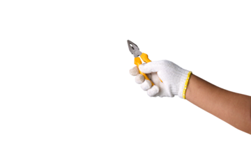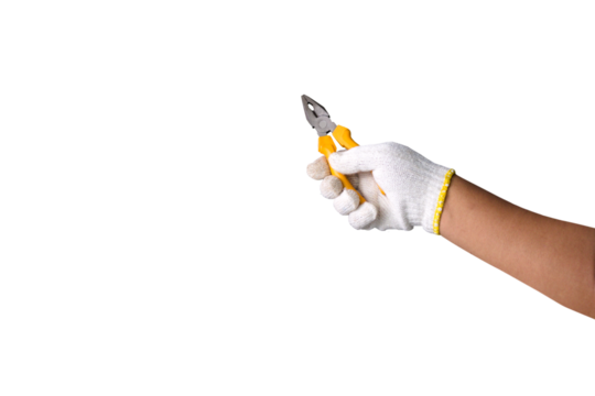 Photo of white gloved hand holding yellow pliers isolated on transparent background png file