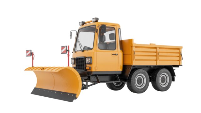 Bright yellow municipal utility truck equipped with a front snow plow and a rear dump bed, ideal for winter road maintenance. background removed