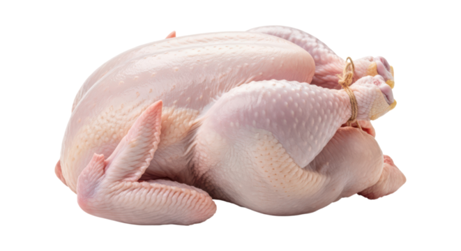 Whole uncooked plucked chicken with visible skin texture on transparent background.