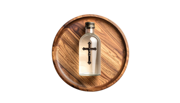 Vintage Holy Water Bottle with Christian Cross on Wooden Plate Isolated on solid white Background in Png form.