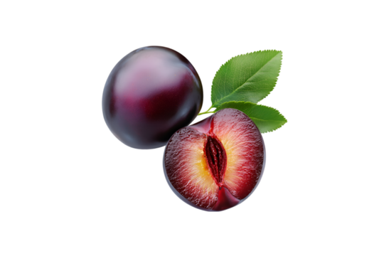 Fresh purple plum with green leaf, isolated on transparent cutout background
