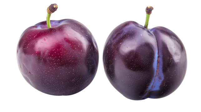 Two fresh dark purple plums isolated on transparent background