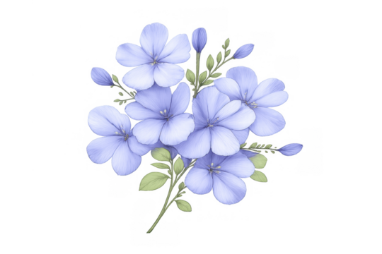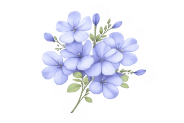 Blue plumbago flower bouquet creating a beautiful floral watercolor illustration with green leaves, transparent background