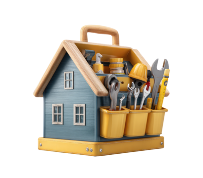 Metal toolbox displaying professional-grade hand tools - hammer, wrenches, pliers, screwdriver, tape measure - against transparent backdrop