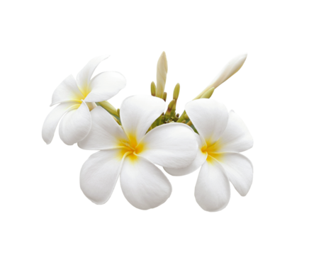 Delicate white plumeria flowers with golden-yellow centers, symbolizing purity and serenity in a minimalist arrangement, isolated on a transparent background