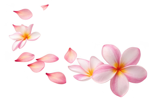 Pink plumeria flowers and petals isolated on transparent background