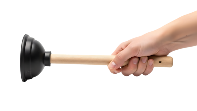 Hand holding black plunger tool for drain cleaning isolated on transparent background