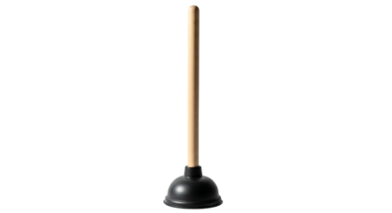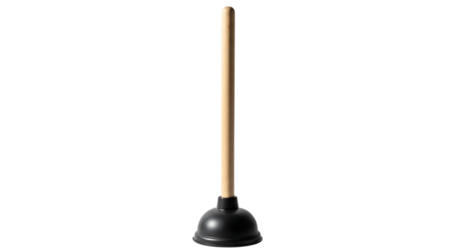 Simple black plunger with wood handle against a clean white studio background in bright, professional light.