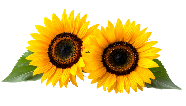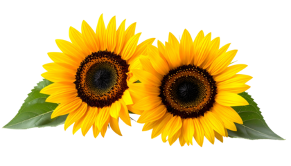 Two vibrant sunflowers with large yellow petals and dark centers, plus green leaves