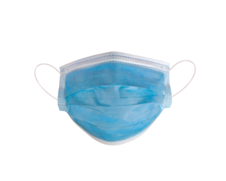 Blue medical protective masks, from different angles isolated on white. Corona virus protection mask with ear loop, in a front, three-quarters, and side views.
