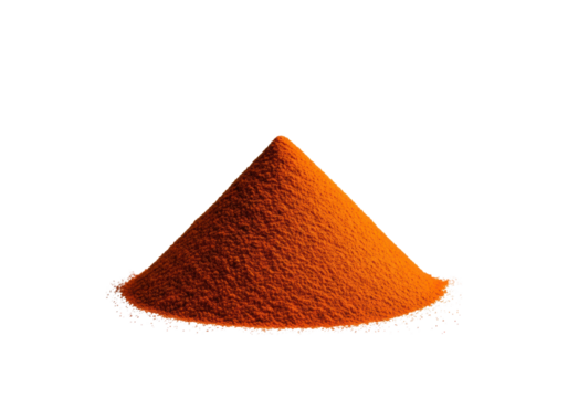 extreme macro photograph of a small, geometrically precise conical mound of hyper-saturated orange granular powder, high-key studio lighting on a transparent background, scientific material study of