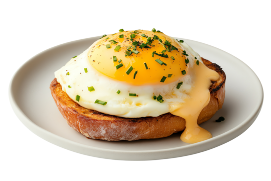 Isolated poached egg dripping on a piece of toast with chives, a tasty culinary breakfast