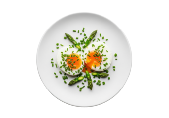 Two perfectly poached eggs with vibrant yolks, chives, asparagus on a minimalist white plate, isolated on a transparent background with copy space, healthy breakfast concept