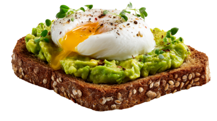 Poached Egg on Toast with Sliced Avocado and Tomato, Top View, isolated on transparent background
