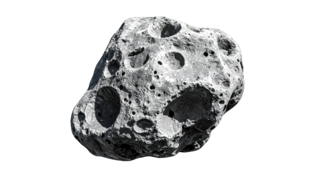 A close-up view of a gray, pockmarked celestial body isolated against a black background, with many craters of varying sizes