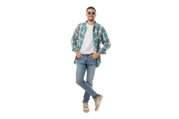 handsome man with friendly expression smiling casually  with his hands in pockets isolated on transparent white background