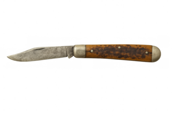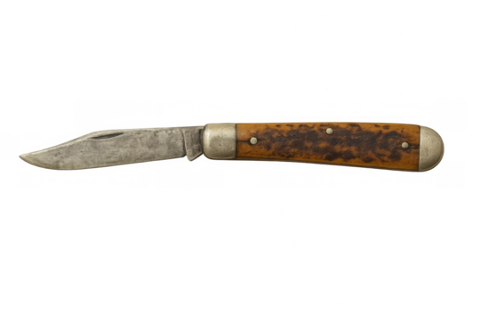 Open vintage pocket knife with worn wooden handle isolated on transparent background, showing signs of age and use