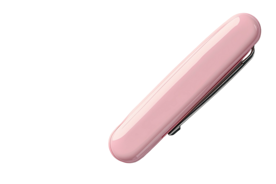 Pink, glossy pocketknife with tools, closed, angled right on black