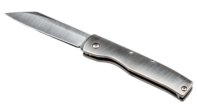 Steel folding pocket knife with sharp metal blade for utility and outdoor activities on transparent background