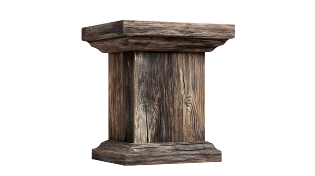 Wooden podium or stand with rustic finish, isolated on white
