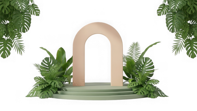 Tropical leaves and beige arch on green podium isolated on transparent background